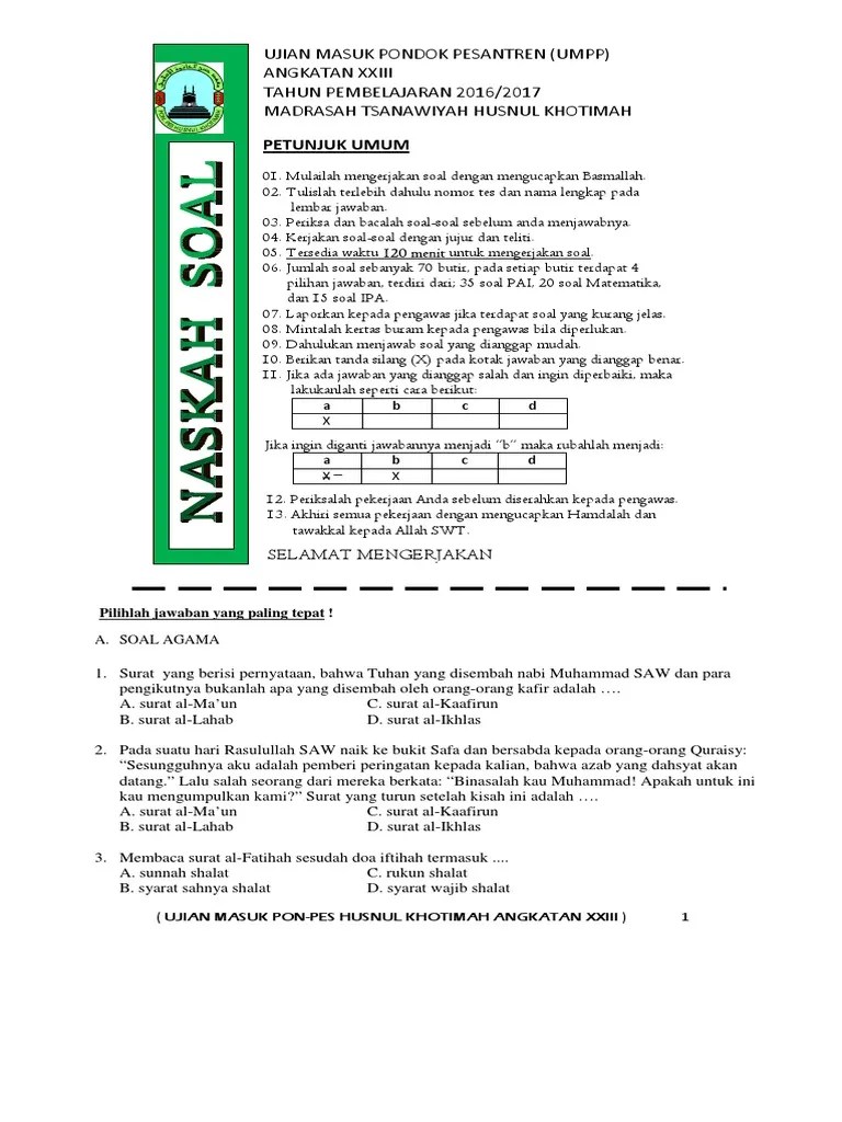 Soal Ujian Seleksi Pesantren : Contoh Soal Tes Masuk Pondok Pesantren Smp Mathlaul Khairiyah Info Wisata Hits - Sistem rating angka (numerical rating system) berguna ketika terdapat banyak factor yang dipertimbangkan.. Pelaksanaan seleksi di titik lokasi luar negeri, bkn bekerjasama dengan kementerian luar negeri dalam melaksanakan ujian di 15 negara. Download as docx, pdf, txt or read online from scribd. Setiap soal hanya dapat dibuka satu kali, ketika soal tersebut telah ditutup maka tidak dapat dibuka kembali. Contoh pertanyaan soal ujian lesan tes wawancara masuk pondok pesantren, tips dan kiat jawaban supaya diterima pada ponpes yang anda tuju. Contoh ada tes intelegensia, tes pengetahuan umum dan tes kemampuan kebangsaan.