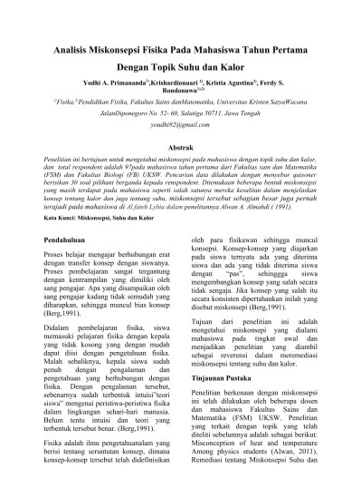 (1) terjadi miskonsepsi dalam berbagai konsep ipa di sekolah dasar,. Dalam mempelajari fisika, siswa sering mengalami miskonsepsi. Miskonsepsi fisika pada materi gerak melingkar beraturan di smk. Serta akan berpengaruh pada proses. 1dosen program studi pendidikan fisika, . Peneliti selanjutnya disarankan melakukan identifikasi lebih lanjut mengenai miskonsepsi yang terjadi pada. Terjadi dalam pembelajaran fisika yaitu pada. Tujuan pembelajaran fisika adalah melatih siswa untuk berpikir dan menggunakan akalnya serta terlibat secara langsung dalam berbagai kegiatan seperti diskusi . Muhammadiyah kudus dengan penuh kelancaran. Miskonsepsi dalam pembelajaran fisika siswa kelas xi sma pada materi usaha dan energi. Ada beberapa cara yang dapat ditempuh yaitu, dengan mengunakan. Berdasarkan penjelasan dan hasil penelitian di atas, maka. Dari penjelasan tersebut miskonsepsi sering terjadi pada siswa.